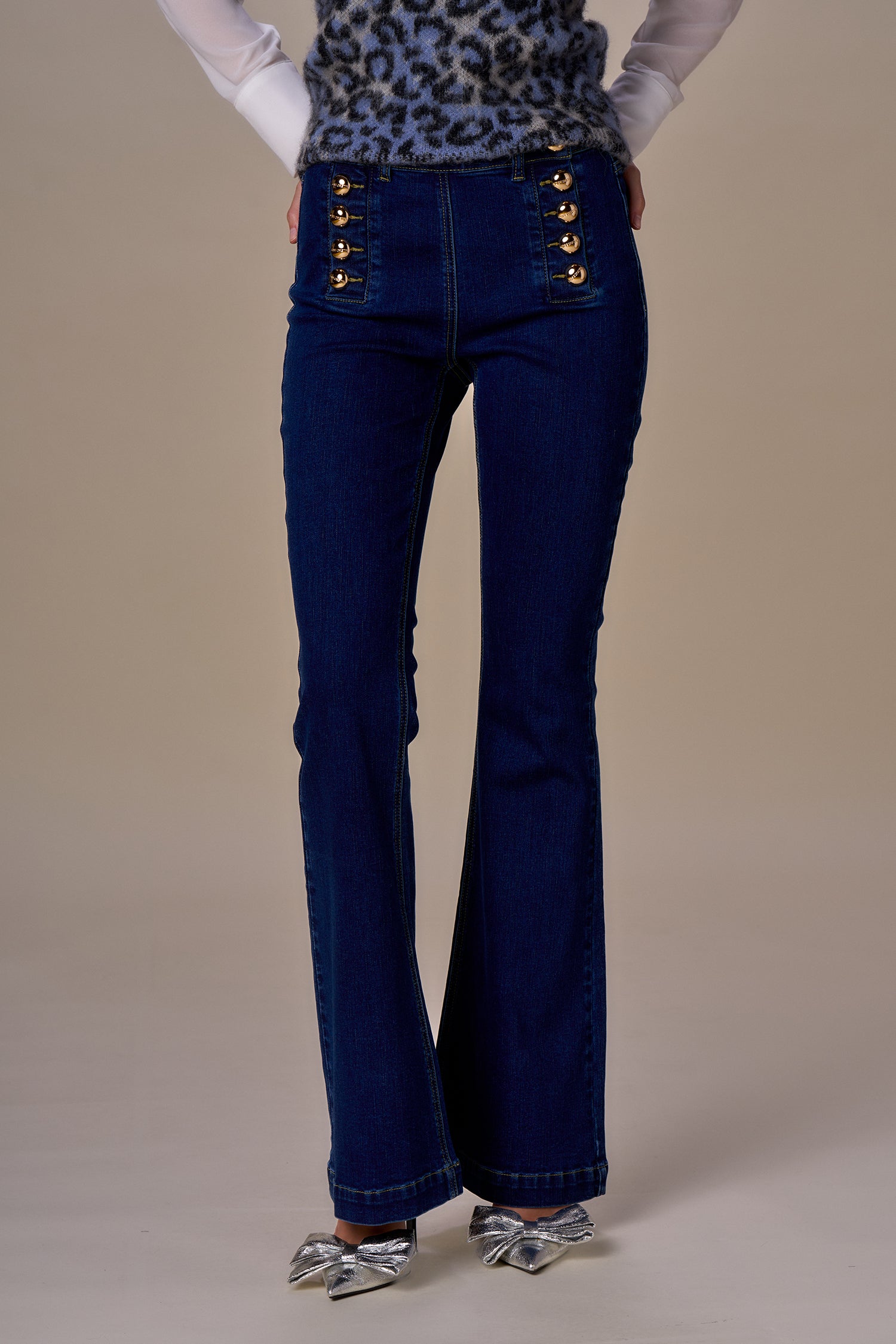 Jeans in denim blu scuro dalla linea flare, caratterizzati da una vestibilità aderente sulla gamba che si apre leggermente verso il fondo. Gli elementi distintivi sono le due file di bottoni metallici dorati poste frontalmente sulla vita, che aggiungono personalità e un tocco retrò al capo. Ideali per valorizzare la figura, questi jeans si abbinano perfettamente sia a bluse eleganti che a maglie casual per look versatili e di tendenza.