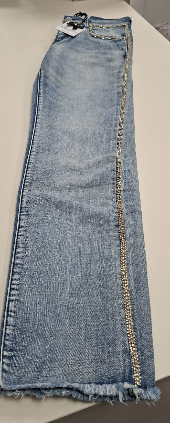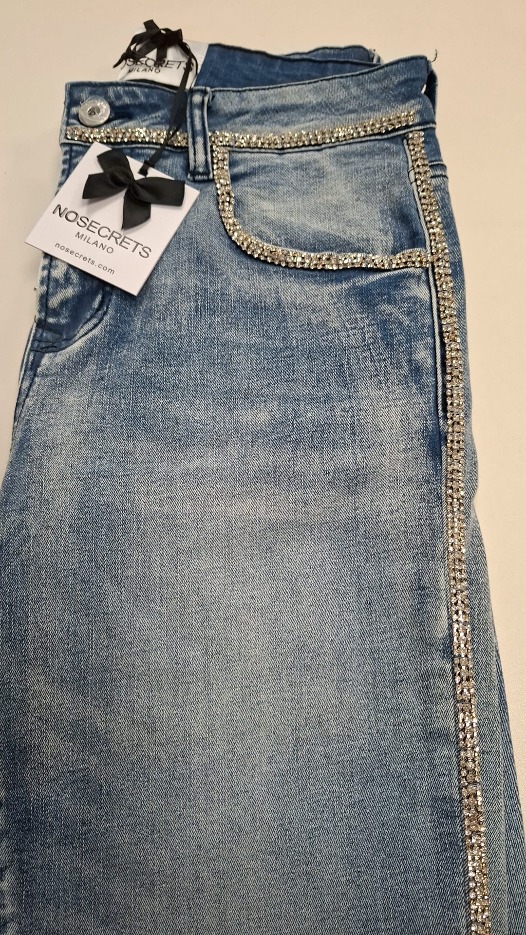 I jeans stretch No Secret Milano con piccola frangia e strass applicati uniscono comfort e stile unico. Vestibilità elastica che valorizza la silhouette, arricchita da dettagli scintillanti che catturano lo sguardo, perfetti per aggiungere un tocco di glamour a ogni outfit casual o serale.